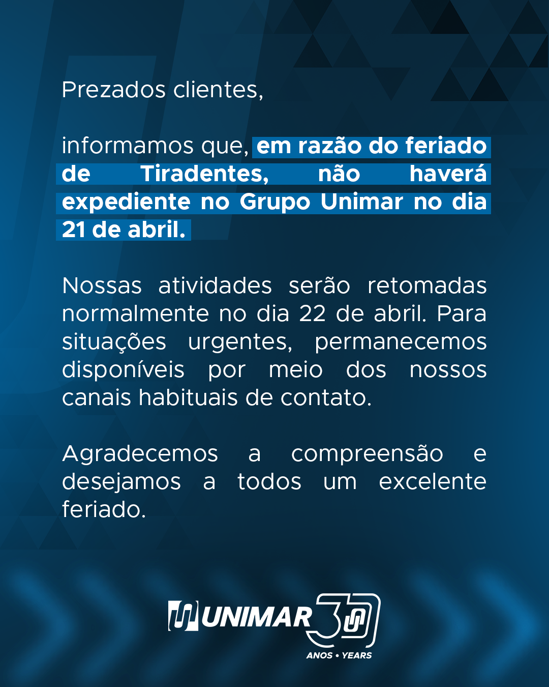 O Grupo Unimar tem como compromisso superar as expectativas dos nossos clientes e buscar soluções sustentáveis, através do Sistema de Gestão Integrado incluindo a consulta e participação dos nossos colaboradores em conformidade com os requisitos normativos aplicáveis relacionados com a qualidade, meio ambiente, saúde e segurança do trabalho e com a segurança da informação, contemplando as seguintes diretrizes:
